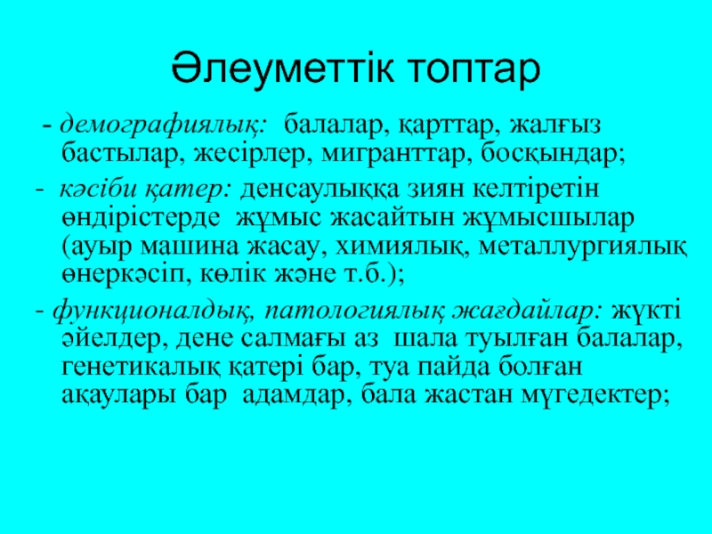 - демографиялық: балалар, қарттар, жалғыз бастылар, жесірлер,
