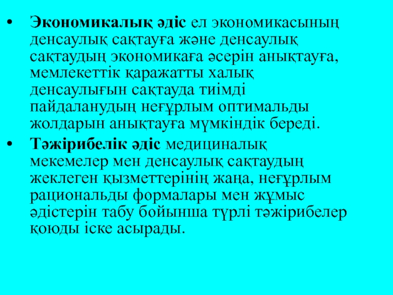 Слайд 15Экономикалық әдіс ел экономикасының денсаулық сақтауға және денсаулық сақтаудың экономикаға