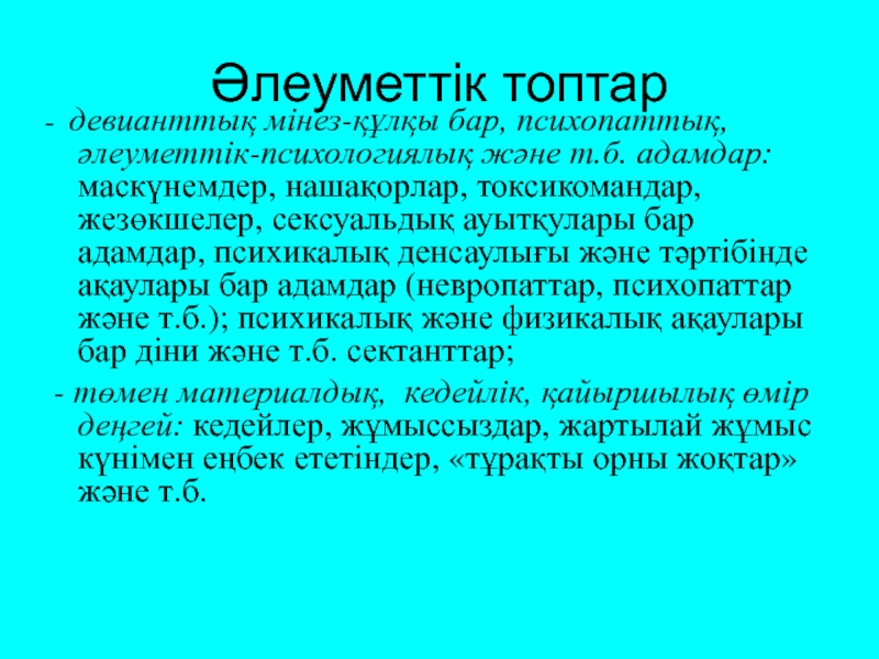 - девианттық мінез-құлқы бар, психопаттық, әлеуметтік-психологиялық және т.б. адамдар: