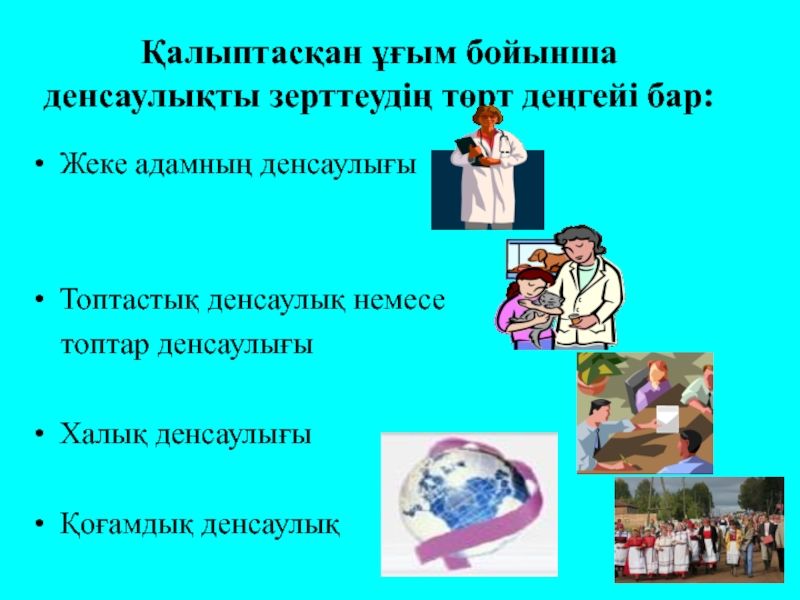 Слайд 13Қалыптасқан ұғым бойынша денсаулықты зерттеудің төрт деңгейі бар: