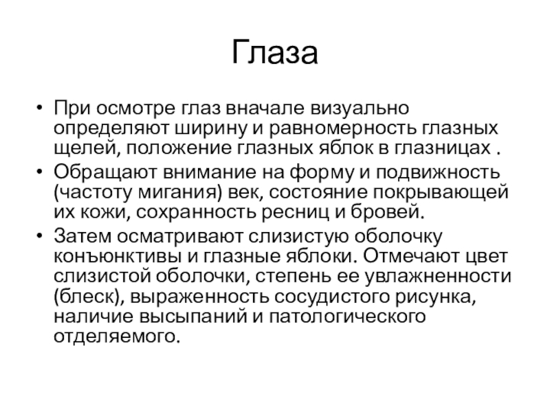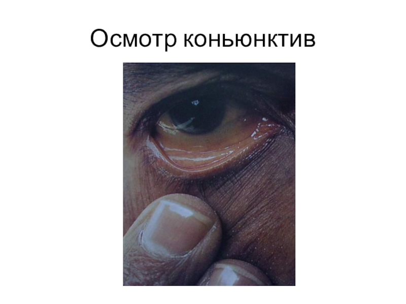 Затем осматривают слизистую оболочку конъюнктивы и глазные яблоки. Отмечают цвет слизистой оболочки, степень ее увлажненности (блеск), выраженность сосудистого рисунка, наличие высыпаний и патологического отделяемого.