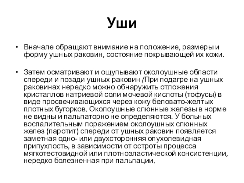 спереди и позади ушных раковин (При подагре на ушных раковинах нередко можно обнаружить отложения кристаллов натриевой соли мочевой кислоты (тофусы) в виде просвечивающихся через кожу беловато-желтых плотных бугорков. Околоушные слюнные железы в норме не видны и пальпаторно не определяются. У больных воспалительным поражением околоушных слюнных желез (паротит) спереди от ушных раковин появляется заметная одно- или двухсторонняя опухолевидная припухлость, в зависимости от остроты процесса мягкотестовидной или плотноэластической консистенции, нередко болезненная при пальпации.