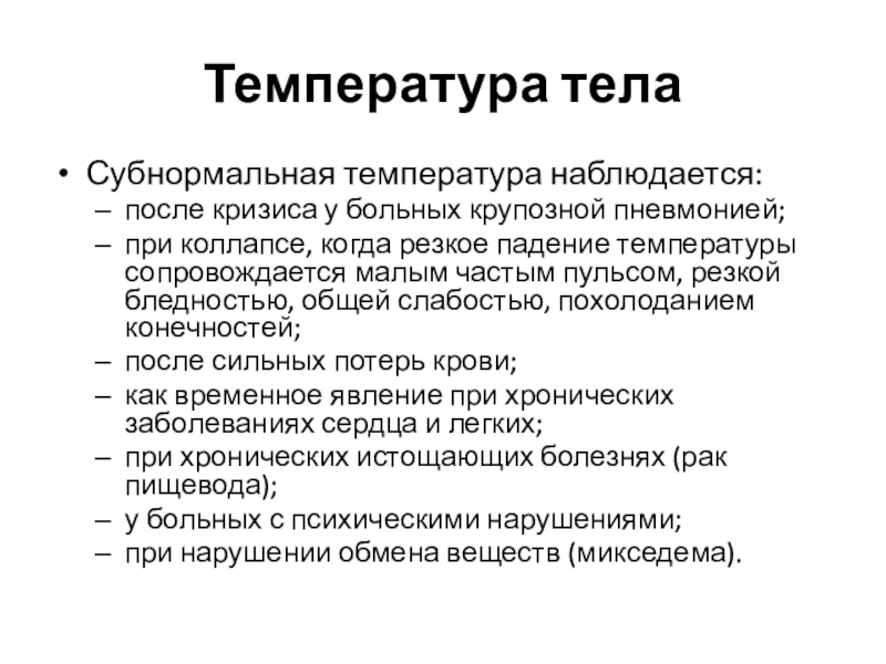 когда резкое падение температуры сопровождается малым частым пульсом, резкой бледностью,