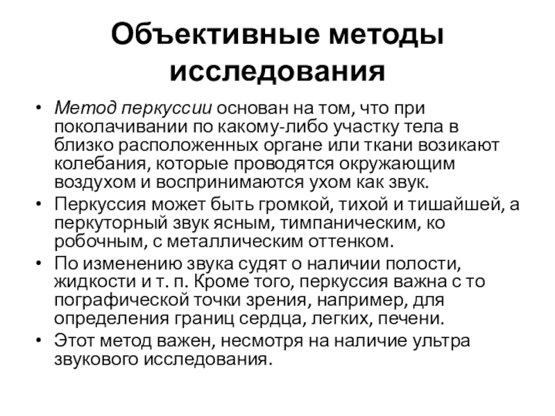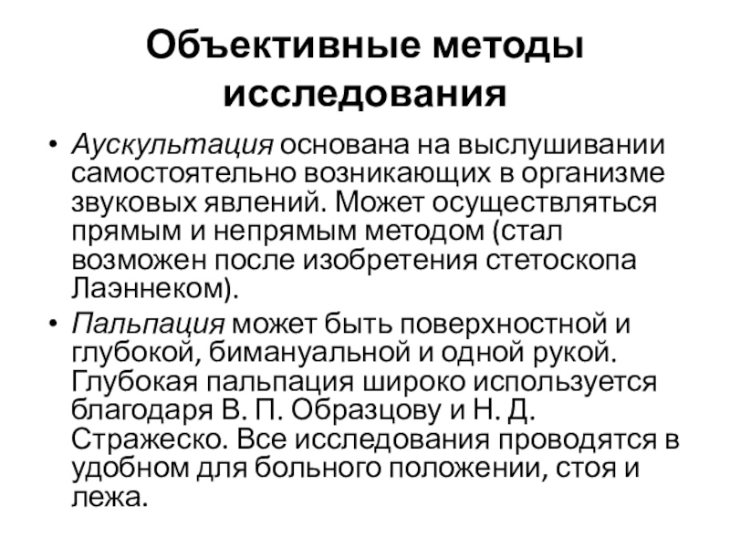 Основные методы исследования могут быть объективными или физикальными (осмотр, пальпация, перкуссия, аускультация) и субъективными (расспрос).