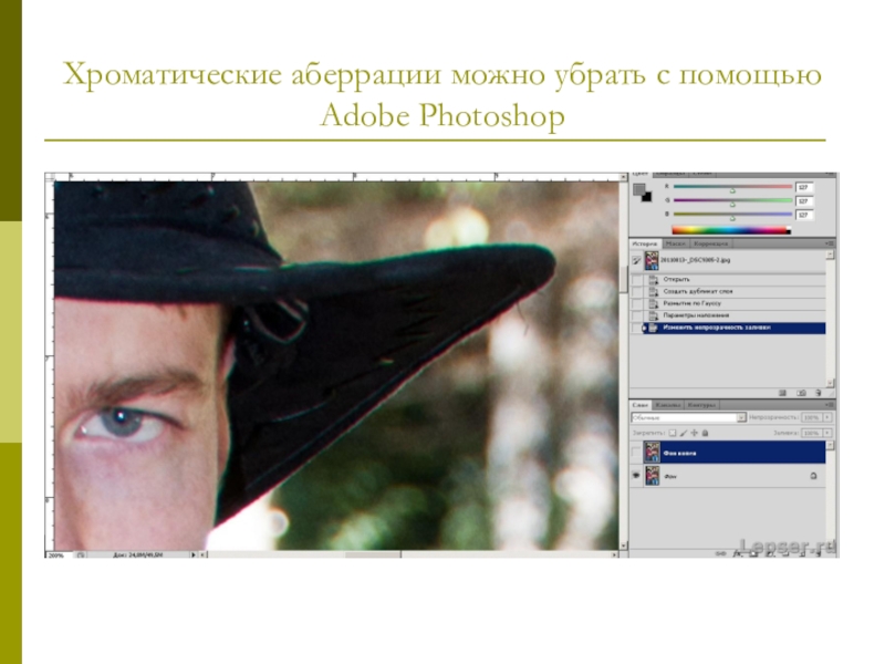 Слайд 71Хроматические аберрации можно убрать с помощью Adobe Photoshop