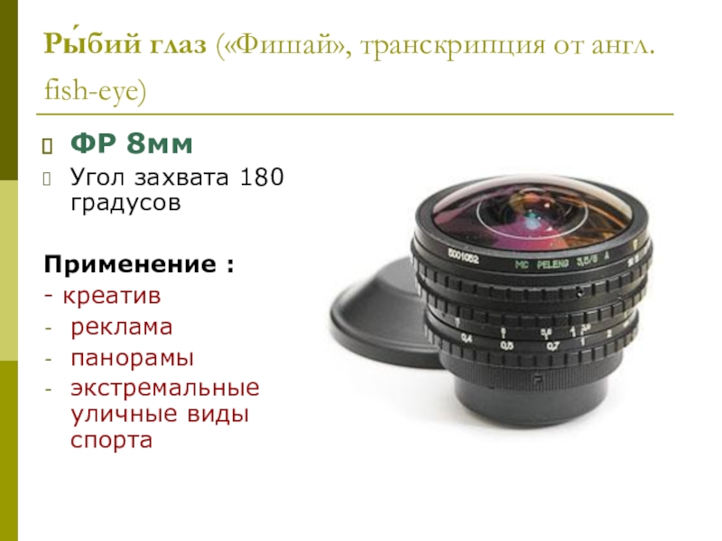 Слайд 22Ры́бий глаз («Фишай», транскрипция от англ. fish-eye)