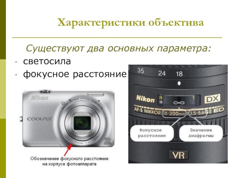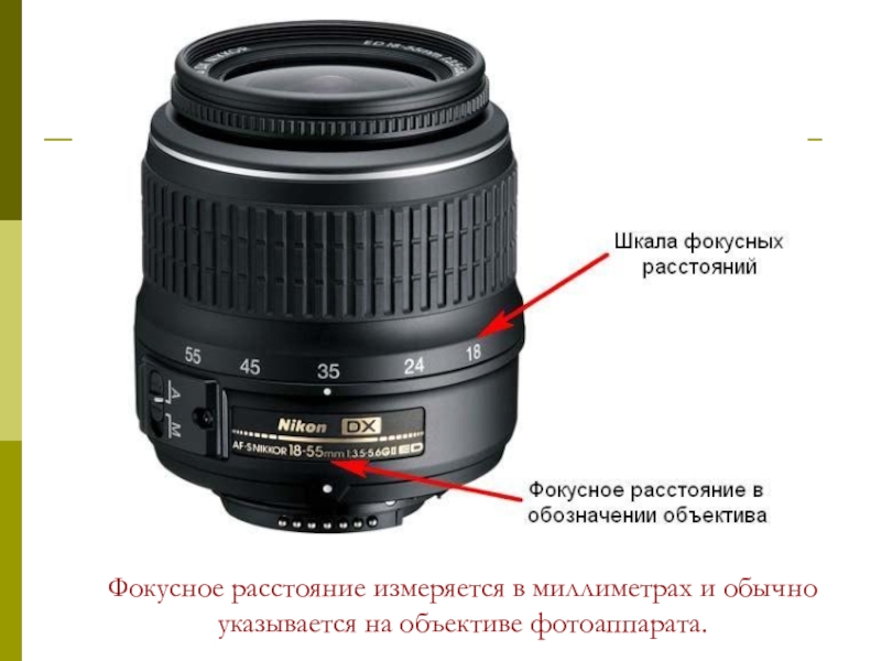 Слайд 15Фокусное расстояние измеряется в миллиметрах и обычно указывается на объективе