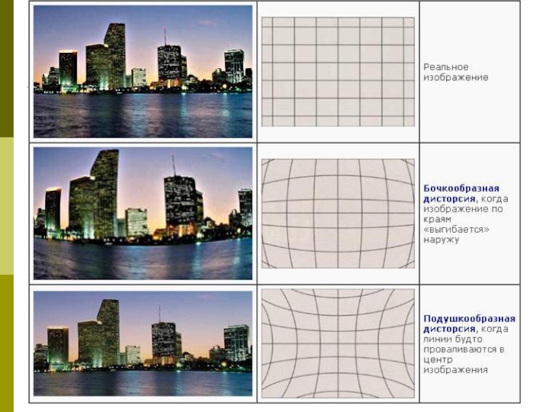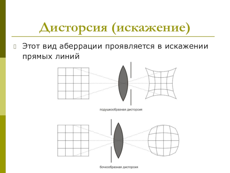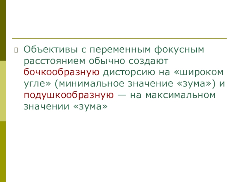 Слайд 76Объективы с переменным фокусным расстоянием обычно создают бочкообразную дисторсию на