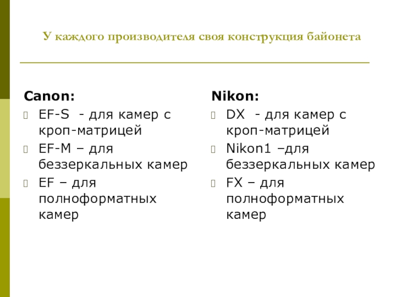 Слайд 6Байонет – это система крепления объектива к фотокамере, при помощи которой
