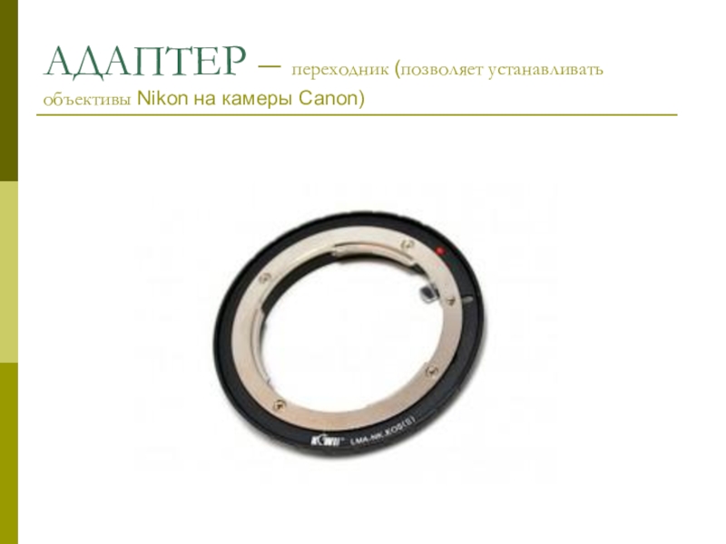 Слайд 60АДАПТЕР – переходник (позволяет устанавливать объективы Nikon на камеры Canon)