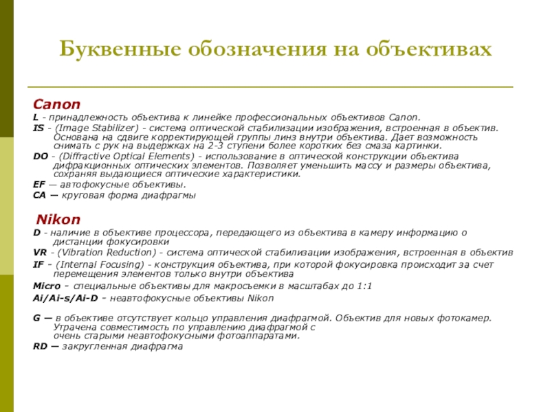 D - наличие в объективе процессора, передающего из объектива в камеру информацию о дистанции фокусировки