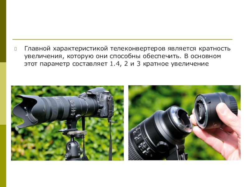 Слайд 51Главной характеристикой телеконвертеров является кратность увеличения, которую они способны обеспечить.