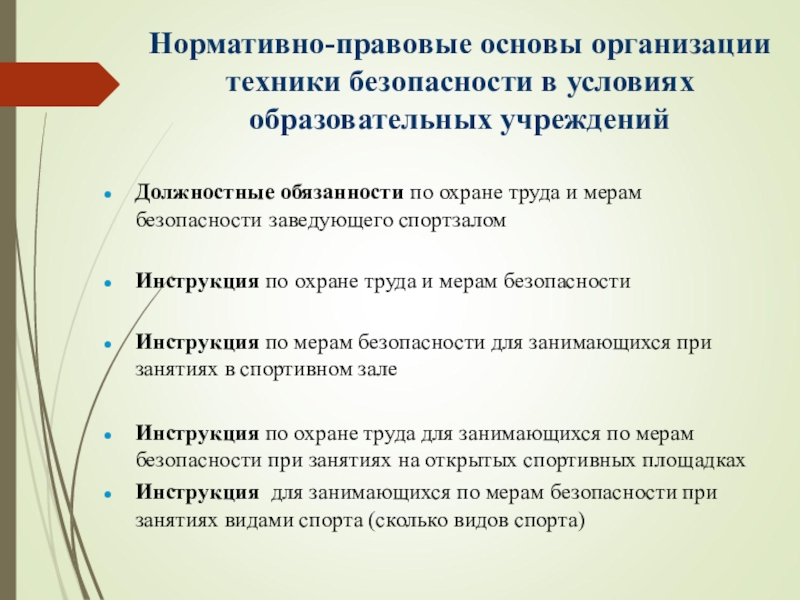 Слайд 9Нормативно-правовые основы организации техники безопасности в условиях образовательных учреждений