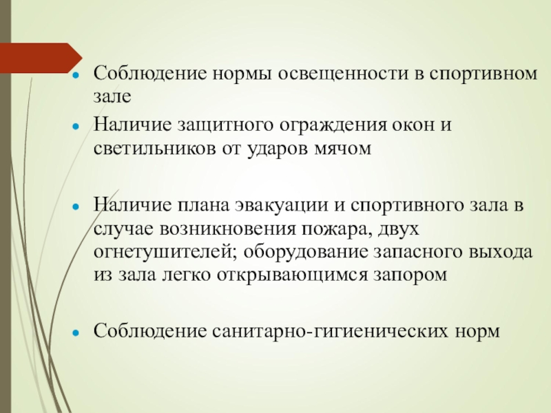 Слайд 23Соблюдение нормы освещенности в спортивном зале