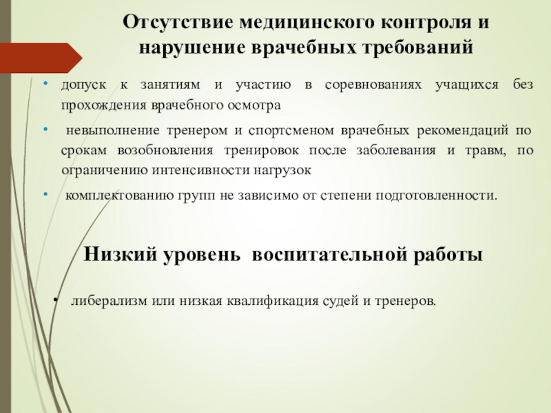 Отсутствие медицинского контроля и нарушение врачебных требований