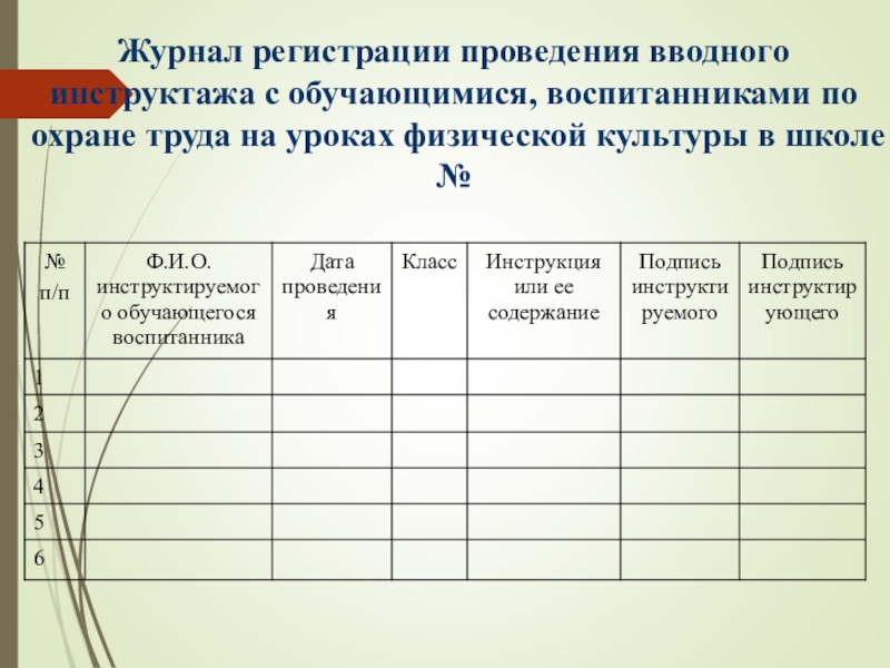 Слайд 21Журнал регистрации проведения вводного инструктажа с обучающимися, воспитанниками по охране