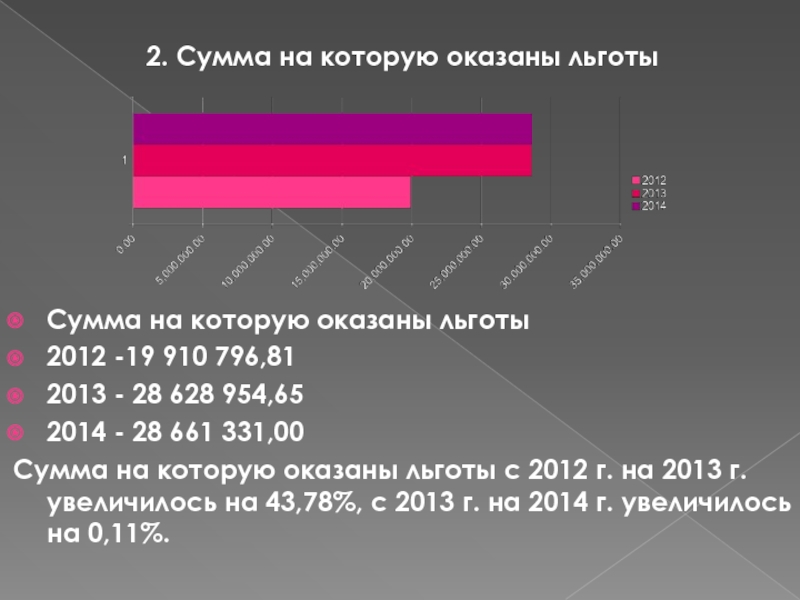 Сумма на которую оказаны льготы с 2012 г. на 2013 г. увеличилось на 43,78%, с 2013 г. на 2014 г. увеличилось на 0,11%.