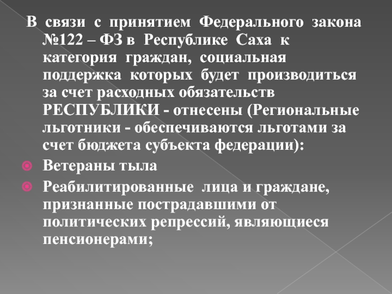 производиться за счет расходных обязательств РЕСПУБЛИКИ - отнесены (Региональные льготники - обеспечиваются льготами за счет бюджета субъекта федерации):