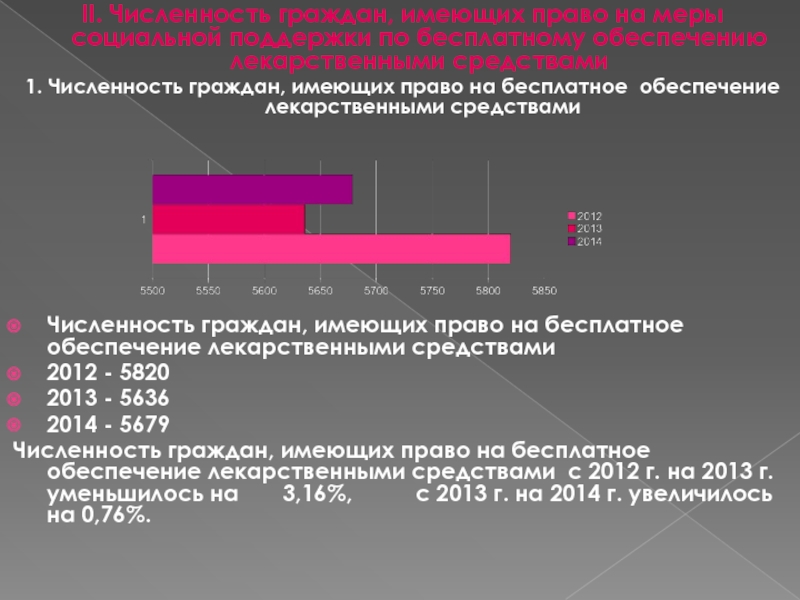 Численность граждан, имеющих право на бесплатное обеспечение лекарственными средствами с 2012 г. на 2013 г. уменьшилось на 3,16%, с 2013 г. на 2014 г. увеличилось на 0,76%.