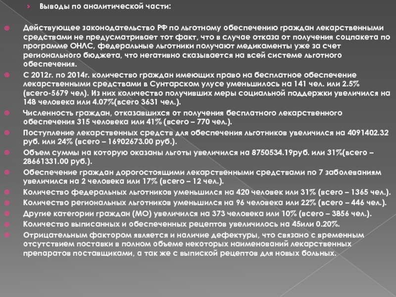С 2012г. по 2014г. количество граждан имеющих право на бесплатное обеспечение лекарственными средствами в Сунтарском улусе уменьшилось на 141 чел. или 2.5% (всего-5679 чел). Из них количество получивших меры социальной поддержки увеличился на 148 человека или 4.07%(всего 3631 чел.).