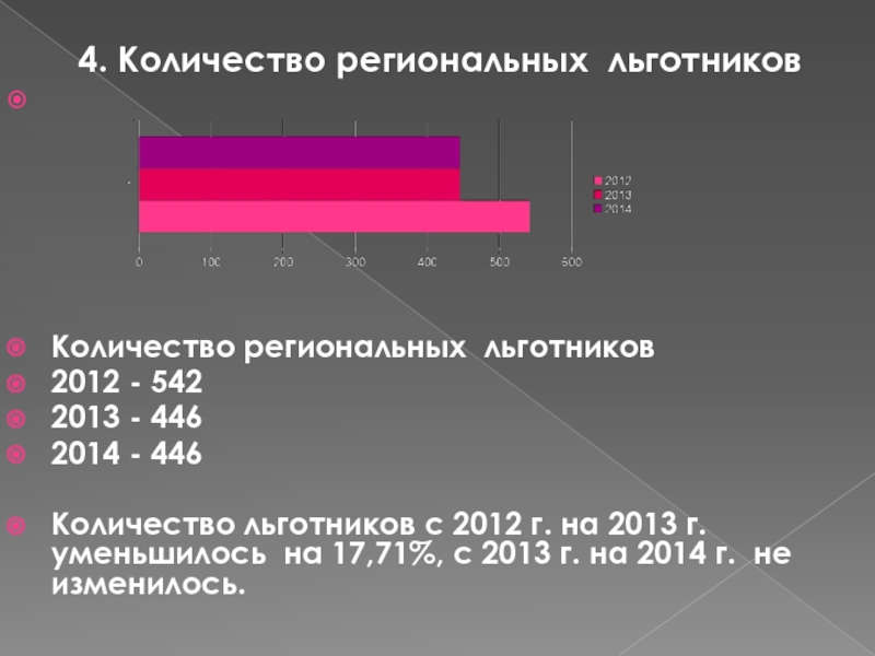 Количество региональных льготников уменьшился на 96 человека или 22% (всего – 446 чел.).