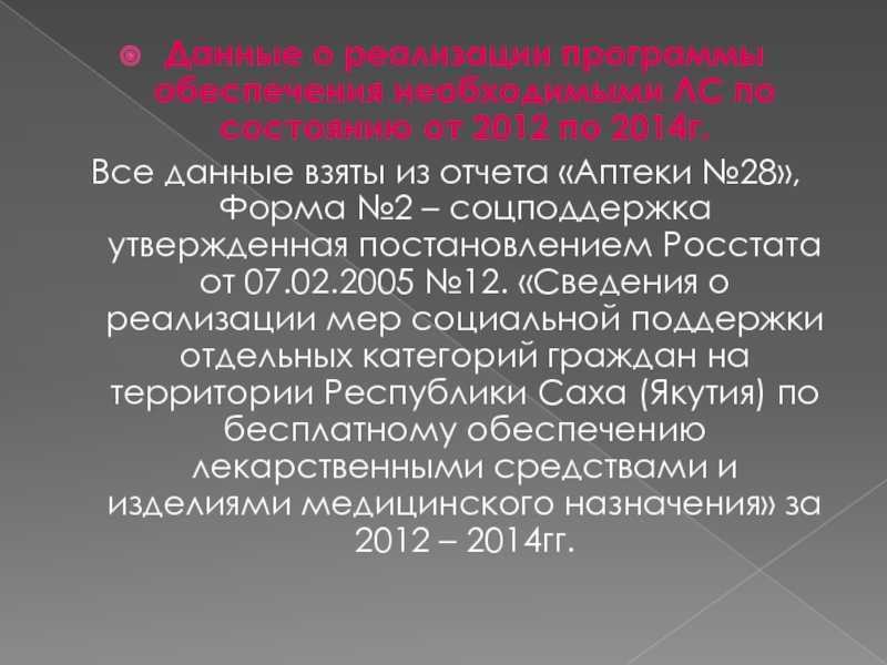 Форма №2 – соцподдержка утвержденная постановлением Росстата от 07.02.2005 №12. «Сведения о реализации мер социальной поддержки отдельных категорий граждан на территории Республики Саха (Якутия) по бесплатному обеспечению лекарственными средствами и изделиями медицинского назначения» за 2012 – 2014гг.