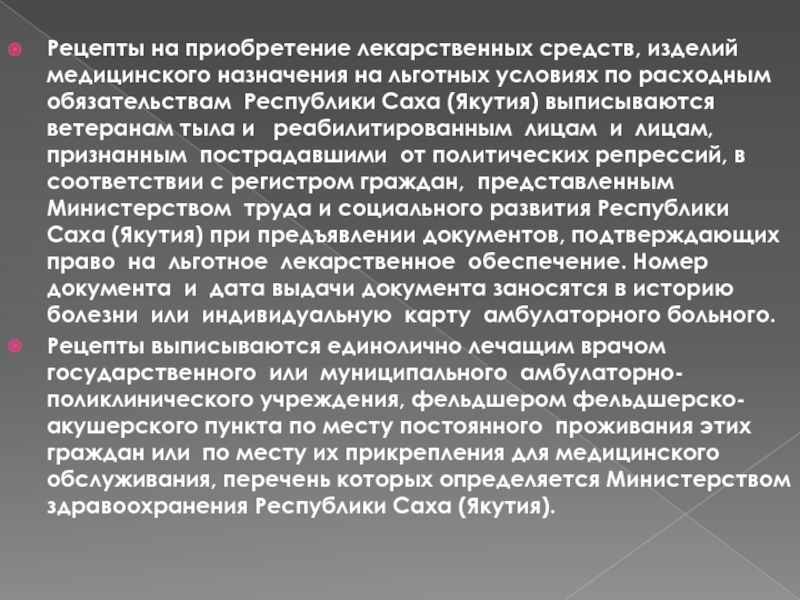 и реабилитированным лицам и лицам, признанным пострадавшими от политических репрессий, в соответствии с регистром граждан, представленным Министерством труда и социального развития Республики Саха (Якутия) при предъявлении документов, подтверждающих право на льготное лекарственное обеспечение. Номер документа и дата выдачи документа заносятся в историю болезни или индивидуальную карту амбулаторного больного.