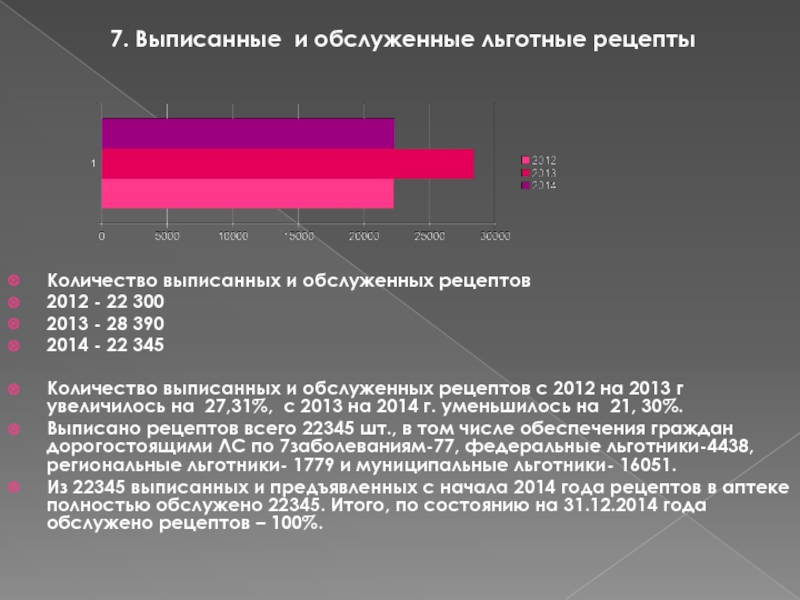 и обслуженных рецептов с 2012 на 2013 г увеличилось на 27,31%, с 2013 на 2014 г. уменьшилось на 21, 30%.