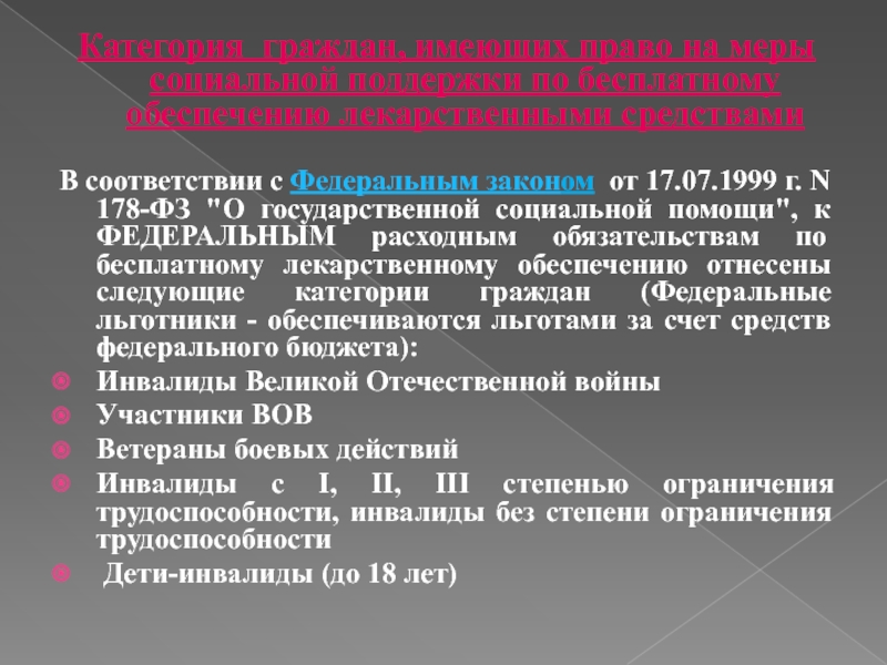 N 178-ФЗ "О государственной социальной помощи", к ФЕДЕРАЛЬНЫМ расходным обязательствам по бесплатному лекарственному обеспечению отнесены следующие категории граждан (Федеральные льготники - обеспечиваются льготами за счет средств федерального бюджета):