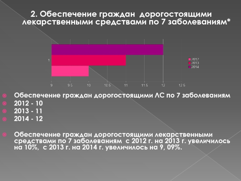 Обеспечение граждан дорогостоящими лекарственными средствами по 7 заболеваниям с 2012 г. на 2013 г. увеличилось на 10%, с 2013 г. на 2014 г. увеличилось на 9, 09%.