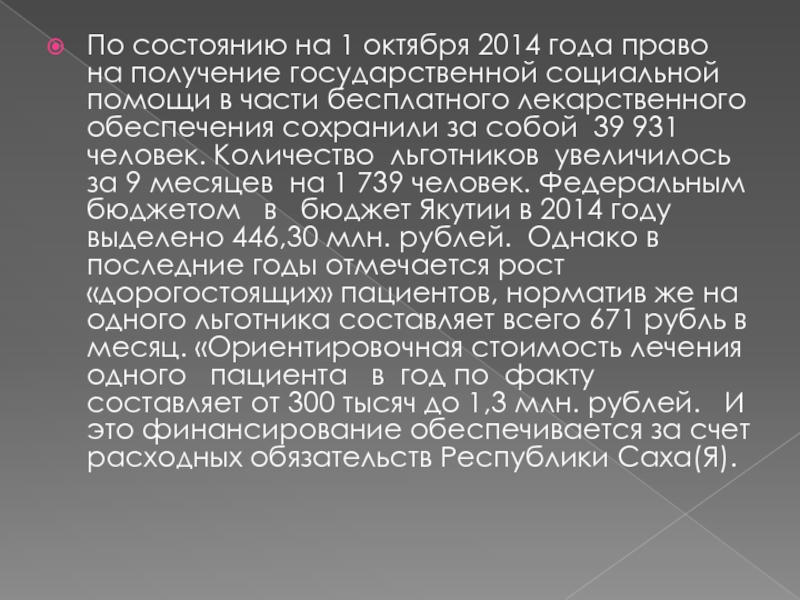 собой 39 931 человек. Количество льготников увеличилось за 9 месяцев на 1 739 человек. Федеральным бюджетом в бюджет Якутии в 2014 году выделено 446,30 млн. рублей. Однако в последние годы отмечается рост «дорогостоящих» пациентов, норматив же на одного льготника составляет всего 671 рубль в месяц. «Ориентировочная стоимость лечения одного пациента в год по факту составляет от 300 тысяч до 1,3 млн. рублей. И это финансирование обеспечивается за счет расходных обязательств Республики Саха(Я).