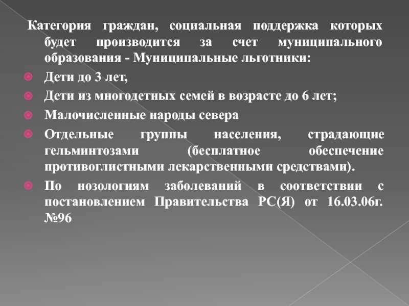 Слайд 4Категория граждан, социальная поддержка которых будет производится за счет муниципального