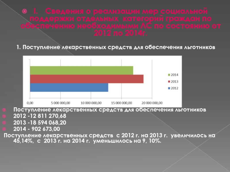 Поступление лекарственных средств с 2012 г. на 2013 г. увеличилось на 45,14%, с 2013 г. на 2014 г. уменьшилось на 9, 10%.