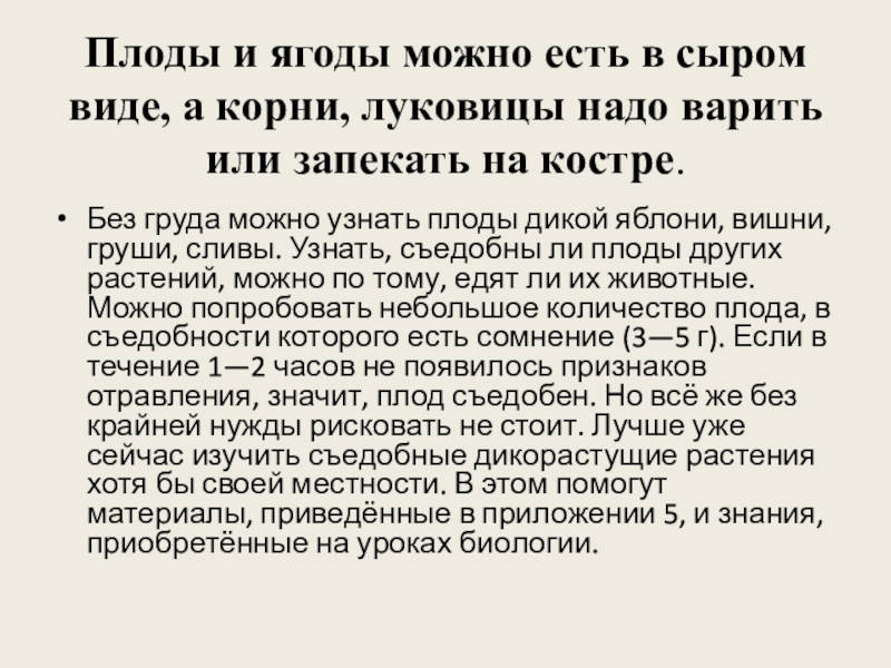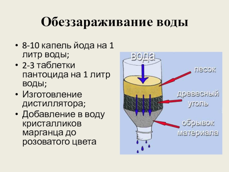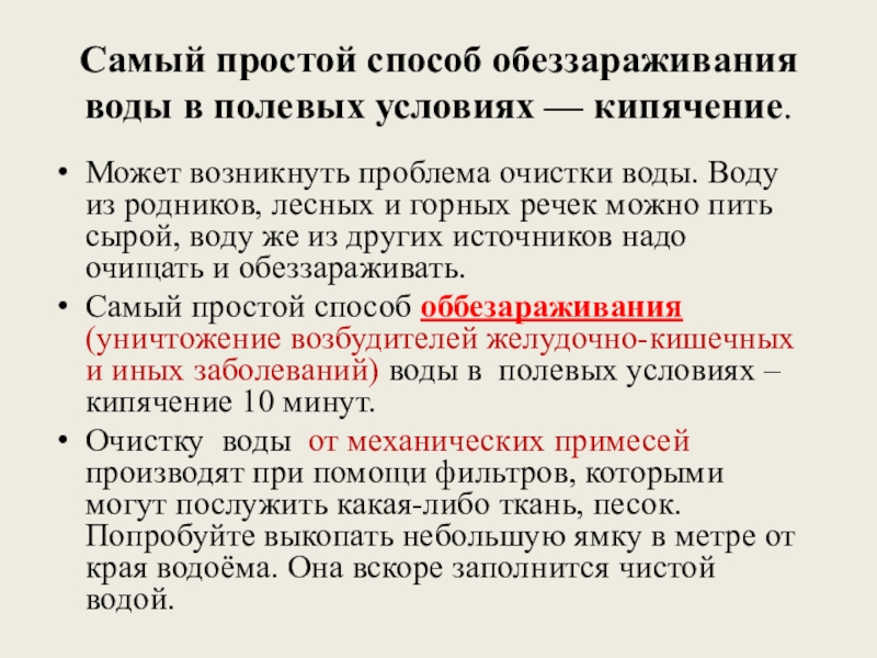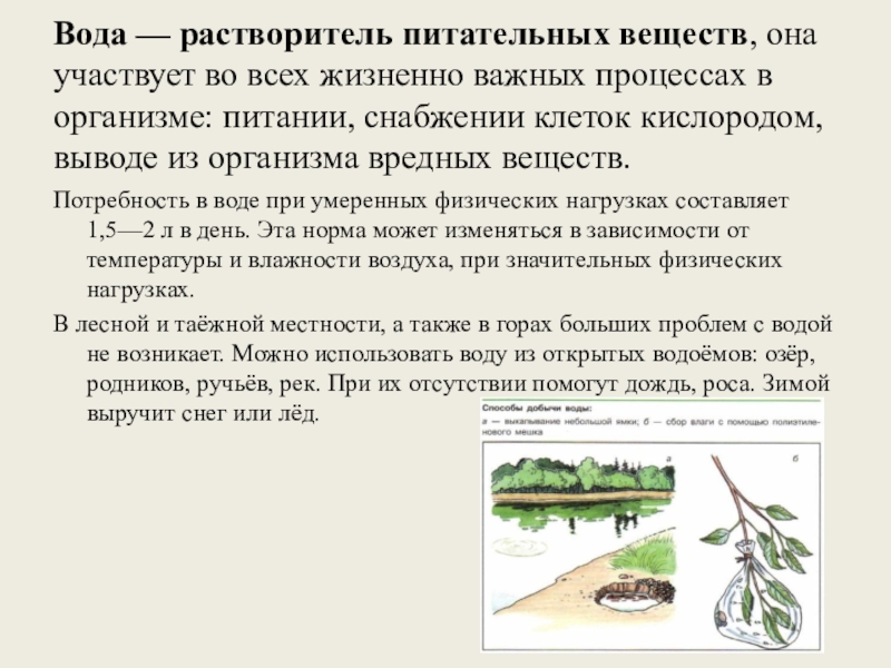 В лесной и таёжной местности, а также в горах больших проблем с водой не возникает. Можно использовать воду из открытых водоёмов: озёр, родников, ручьёв, рек. При их отсутствии помогут дождь, роса. Зимой выручит снег или лёд.