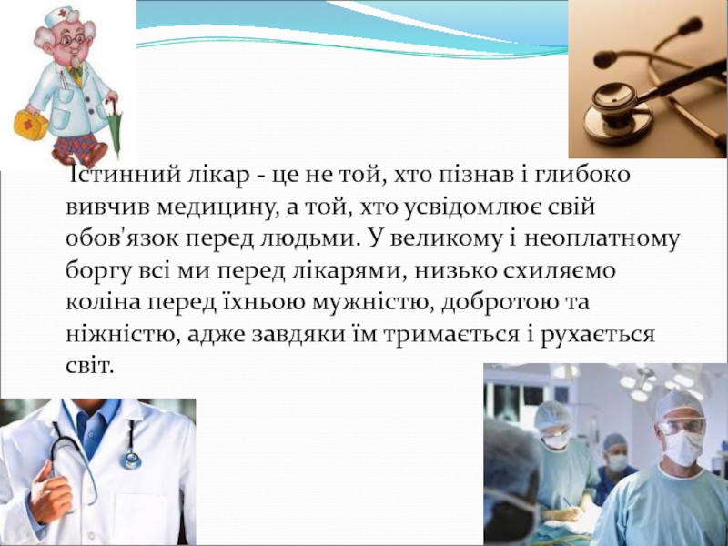 Слайд 15 Істинний лікар - це не той, хто пізнав