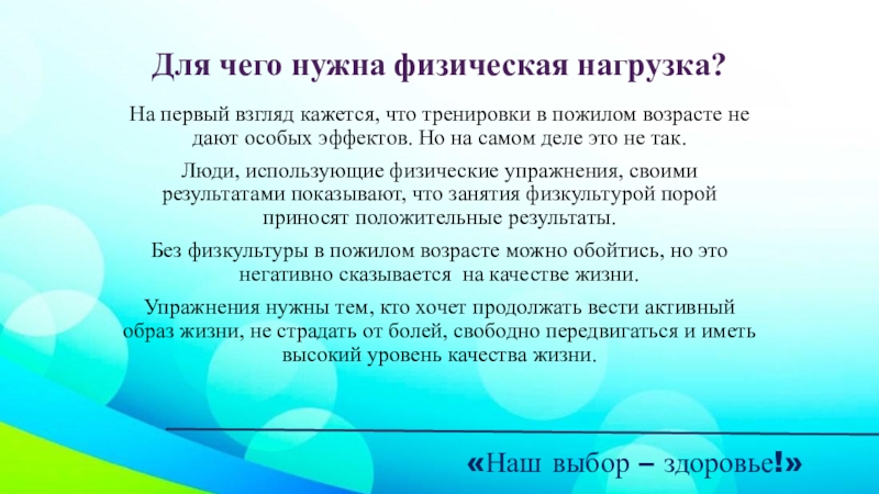 «Наш выбор – здоровье!»Для чего нужна физическая нагрузка?На первый взгляд кажется, что тренировки в пожилом возрасте не