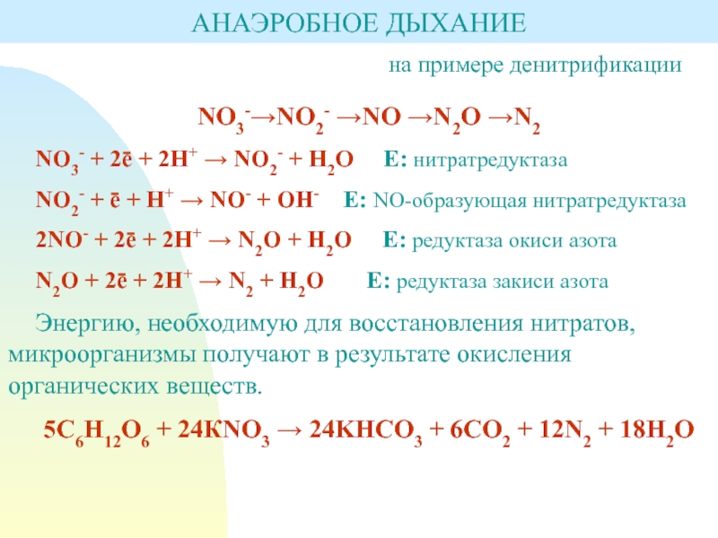 2NO- + 2ē + 2Н+ → N2O + H2O Е: редуктаза окиси азота