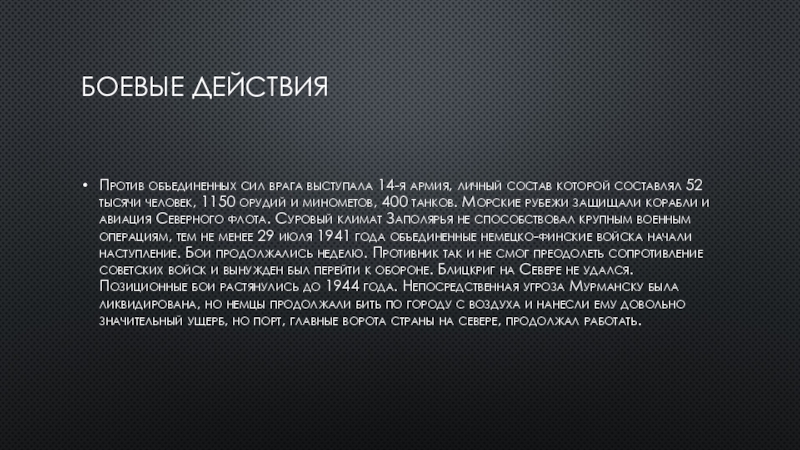 танков. Морские рубежи защищали корабли и авиация Северного флота. Суровый климат Заполярья не способствовал крупным военным операциям, тем не менее 29 июля 1941 года объединенные немецко-финские войска начали наступление. Бои продолжались неделю. Противник так и не смог преодолеть сопротивление советских войск и вынужден был перейти к обороне. Блицкриг на Севере не удался. Позиционные бои растянулись до 1944 года. Непосредственная угроза Мурманску была ликвидирована, но немцы продолжали бить по городу с воздуха и нанесли ему довольно значительный ущерб, но порт, главные ворота страны на севере, продолжал работать.