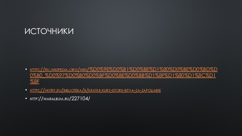 Источникиhttps://ru.wikipedia.org/wiki/%D0%9E%D0%B1%D0%BE%D1%80%D0%BE%D0%BD%D0%B0_%D0%97%D0%B0%D0%BF%D0%BE%D0%BB%D1%8F%D1%80%D1%8C%D1%8Fhttps://histrf.ru/biblioteka/b/kratkii-kurs-istorii-bitva-za-zapoliariehttp://waralbum.ru/227104/