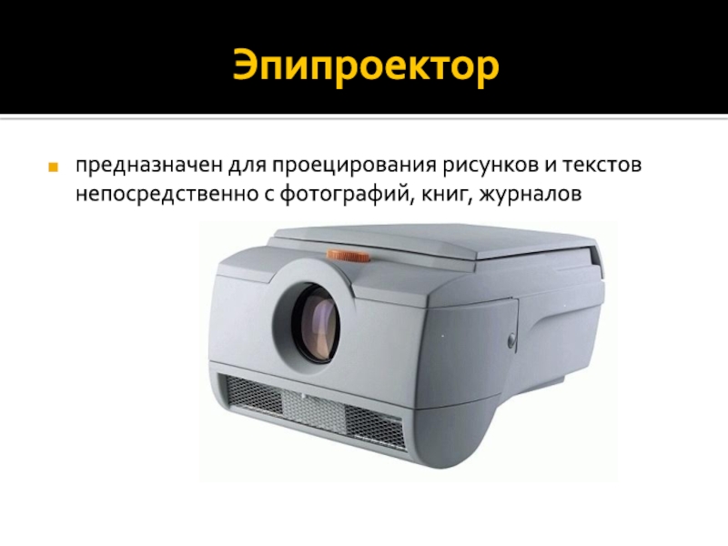 Эпипроекторпредназначен для проецирования рисунков и текстов непосредственно с фотографий, книг, журналов