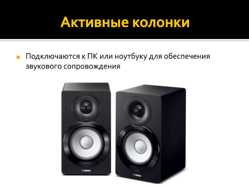 Активные колонкиПодключаются к ПК или ноутбуку для обеспечения звукового сопровождения