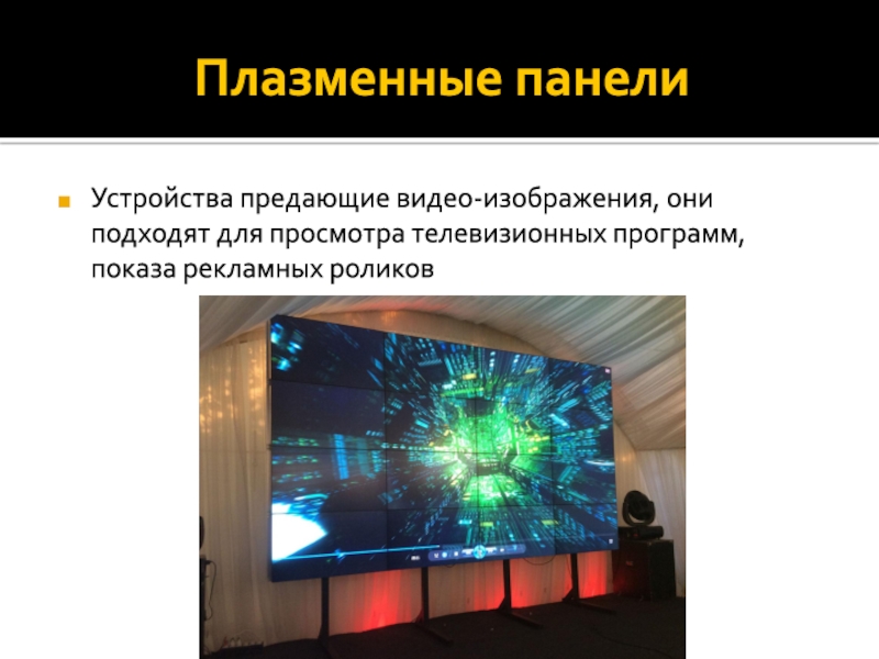 Плазменные панелиУстройства предающие видео-изображения, они подходят для просмотра телевизионных программ, показа рекламных роликов