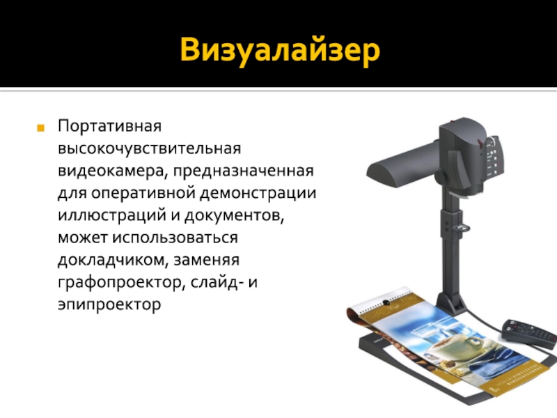 ВизуалайзерПортативная высокочувствительная видеокамера, предназначенная для оперативной демонстрации иллюстраций и документов, может использоваться докладчиком, заменяя графопроектор, слайд- и