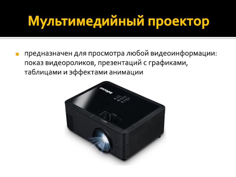 Мультимедийный проекторпредназначен для просмотра любой видеоинформации: показ видеороликов, презентаций с графиками, таблицами и эффектами анимации