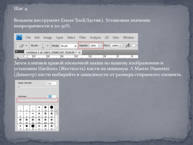 Шаг 4.Возьмем инструмент Eraser Tool(Ластик). Установим значение непрозрачности в 20-30%.Затем кликнем правой кнопочкой мыши по нашему изображению