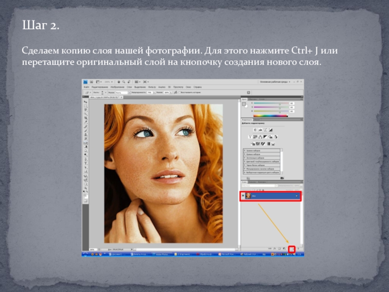 Шаг 2.Сделаем копию слоя нашей фотографии. Для этого нажмите Ctrl+ J или перетащите оригинальный слой на кнопочку
