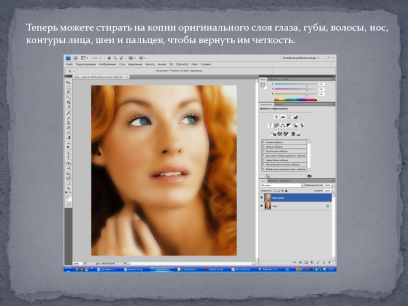 Слайд 6Теперь можете стирать на копии оригинального слоя глаза, губы, волосы,