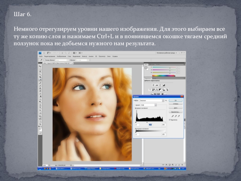 Шаг 6.Немного отрегулируем уровни нашего изображения. Для этого выбираем все ту же копию слоя и нажимаем Ctrl+L