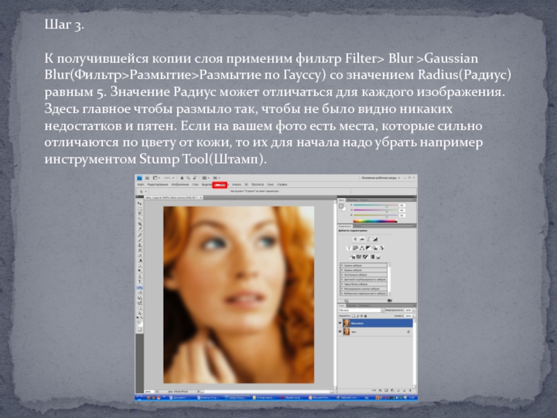 Шаг 3.К получившейся копии слоя применим фильтр Filter> Blur >Gaussian Blur(Фильтр>Размытие>Размытие по Гауссу) со значением Radius(Радиус) равным