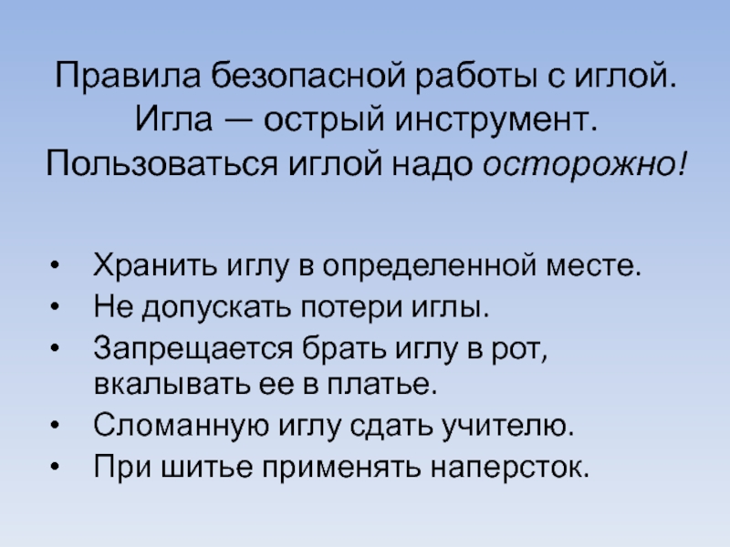 Слайд 3Правила безопасной работы с иглой. Игла — острый инструмент. Пользоваться иглой